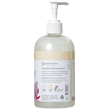 Ginger Lily Farms Botanicals All-Purpose Liquid Hand Soap is enriched with vitamins, natural exfoliants and antioxidants and contains pure extract of aloe vera, flaxseed and citric acid to leave skin feeling clean and smooth. Our toxin-free hand soap is cruelty-free, 100% vegan and contains no parabens, phosphate, sulfate or gluten. The unscented formula easily washes away dirt and germs and safely lathers on skin so you can stay protected and clean. A small drop goes a long way as the liquid hand soap quickly creates a rich, satisfying lather that leaves skin deeply hydrated and refreshingly clean. Natural ingredients moisturize and hydrate the skin to prevent dry hands after multiple washes a day. Refill size is perfect for fitness centers, hotels, spas, salons, and home use. Ginger Lily Farms is PETA certified. Directions: Apply Ginger Lily Farms Botanicals All-Purpose Fragrance-Free Hand Soap to wet hands. Rub hands together thoroughly for 20 seconds. Rinse and dry hands. When To Wash Hands: Before: Before eating Before, during, and after preparing food Before and after caring from someone who is sick Before and after treating a cut or wound Before meetings or gatherings After: After using the restroom After touching shared surfaces After blowing your nose, coughing, or sneezing After eating After touching garbage