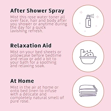 - RELAX AND UNWIND ANYTIME: Spray on your bed sheets or pillowcase before bedtime, or add to your bath for a calming experience. This rosewater toner face refreshes your senses, while the rosewater toner soothes skin. You can also use it as a rose water spray for hair to enjoy a light, floral scent and relaxing feel anytime.