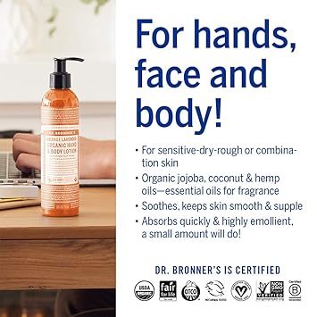 Dr. Bronner's - Organic Lotion (Orange Lavender, 8 Ounce) - Body Lotion and Moisturizer, Certified Organic, Soothing for Hands, Face and Body, Highly Emollient, Nourishes and Hydrates, Vegan, Non-GMO