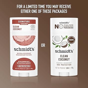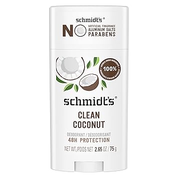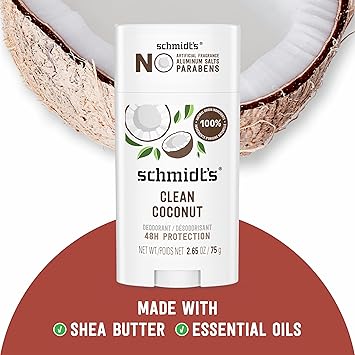 Really Works. Schmidt’s Clean Coconut— Formulated with certified 100% natural origin ingredients, this deodorant for women and men is made without aluminum. It’s also certified vegan by Vegan Action and cruelty-free by Leaping Bunny. Our women's and men’s deodorants are naturally enriched with magnesium to help neutralize odor and keep you fresh with 24-hour odor protection that’s gentle on skin. Schmidt’s offers some of the best smelling deodorants for men and women and is made with plant-based oils and butters like coconut oil, jojoba seed oil, and shea moisture butter, as well as vitamin E. Luxurious, long-lasting scents made with 100% natural origin fragrance are never synthetic, always made with plant isolates and essential oils like tea tree oil, jasmine oil, and lavender oil. All our Schmidt’s vegan deodorant sticks require only a small amount for overall effectiveness. To use, hold the deodorant briefly to skin to soften on contact with your body heat. Gently apply 1-2 swipes to dry, clean underarms to keep you feeling fresh all day. This aluminum free deodorant for men and women uses a non-greasy/non-sticky formula that is easily absorbed. Do not apply to irritated, damaged, or freshly shaved skin.