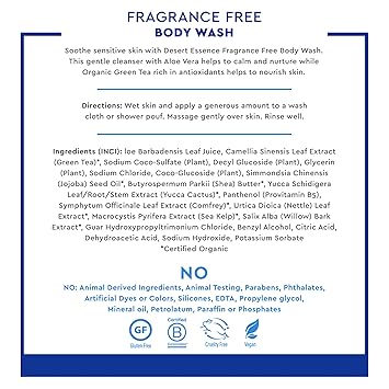 Desert Essence Fragrance Free Body Wash Sensitive Skin-Friendly Plant-Based Cleanser with Organic Aloe, Green Tea & Jojoba Oil - Nourishing Antioxidants - Vegan, Gluten-Free, Cruelty-Free - 8oz