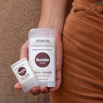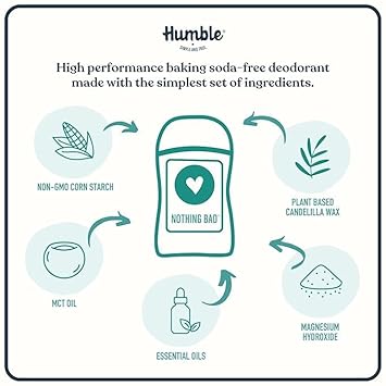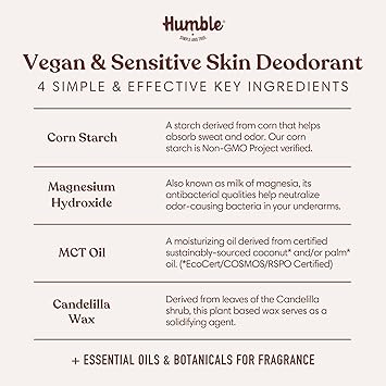 - BAKING SODA-FREE DEODORANT: Humble Brands Aluminum-free Deodorant is made with 4 simple ingredients — non-GMO corn starch, magnesium hydroxide, Wild Candelilla Wax, and MCT oil — to be tough on odor while keeping you smelling fresh.