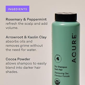 Acure Dry Shampoo - Mini Powder Dry Shampoo for Women with Brunette & Dark Hair, Care to Refresh Treated Color Tinted Hair with Rosemary & Cocoa, Non Aerosol, Clean, 100% Vegan - 1.7 oz Travel Size