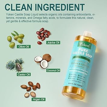 - VERSATILE: Organic castile soap can be used to clean everything. Use it as dish soap, body wash, baby soap, veggie wash, laundry detergent, pet shampoo, shave, household cleaning, bathtub and tile scrub. Explore more with Yoken natural soap liquid!