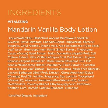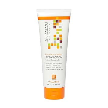 Andalou Naturals Mandarin Vanilla Vitalizing Body Lotion Delight your senses with Andalou Naturals Mandarin Vanilla Body Lotion, a luxurious blend designed to leave your skin feeling soft, hydrated and revitalized. Infused with the refreshing scent of mandarin and warm vanilla, this body lotion combines nourishing cocoa butter, shea butter and ultra-hydrating aloe vera to restore moisture to dry skin. This moisturizing body lotion absorbs quickly, leaving your skin feeling satin smooth and hydrated. Apply all over the body. The meaning of Andalou is ‘Path of Light’, and we believe it best reflects our intention to foster good things in the world and enrich the lives we touch, one responsible product at a time. At Andalou Naturals, we want you to feel empowered and confident in yourself, especially when it comes to what you put on your skin. That's why we infuse Fruit Stem Cell Science with unique and innovative ingredients to provide skincare solutions to target your skincare concerns and support healthy skin. Our products feature only ingredients that are sustainable, formulated without gluten, nature-derived and never tested on animals. Non-GMO remains a core brand value of Andalou Naturals and we continue to source superior non-GMO ingredients for our products.