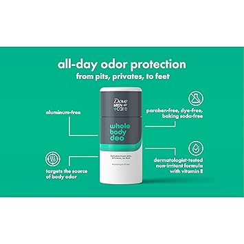 Odor protection isn’t just for your pits anymore. When it comes to deodorant, we know you need the real deal: odor control for your whole body to keep you fresh and confident all day. That’s why we made Dove Men Care Whole Body Deo deodorant stick. Our whole-body deodorant stick provides powerful all-day odor protection that targets odor at the source. This smooth glide stick also helps avoid chafing. Use this deodorant anywhere you need it—from your pits, privates, to feet—to help stop odor in its tracks. Begin your day with a crisp, clean scent, refreshing woody notes, and the peace of mind long-lasting odor protection brings. Our dermatologist-tested formula is non-irritant, aluminum-free, and paraben-free, and it contains vitamin E. Directions for use: Twist the product up and apply directly on clean, dry skin. Our whole body deo is vegan, and Dove is PETA-approved, meaning we do not test on animals anywhere in the world. Looking for more Dove Men Care products? Our whole body deo range is also available in a spray and cream format.
