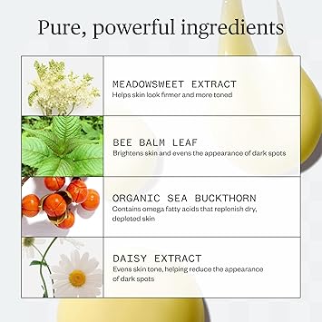- CLEAN SKINCARE - Plant-based formula including Sea Buckthorn to replenish dry skin, Meadowsweet Extract to help skin look firmer and more toned, Bee Balm Leaf to brighten skin and even the appearance of dark spots, and Yarrow Extract - which is rich in antioxidants - to help soothe skin.