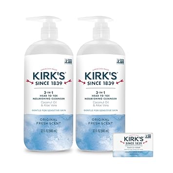 Kirk's 3-in-1 Head to Toe Nourishing Liquid Cleanser & Travel Size Bar Soap - for Men, Women & Children - Premium Coconut Oil and Aloe Vera- Non GMO & Vegan -Original Fresh Scent - 32 Fl Oz. 2 pack