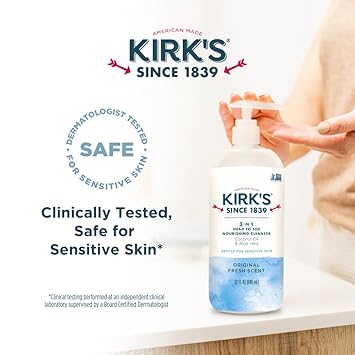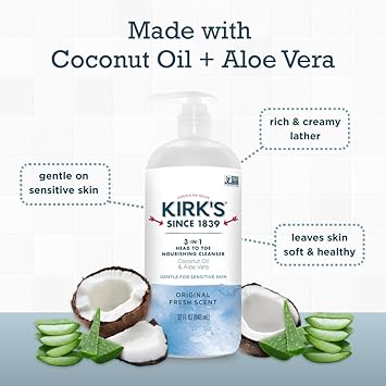- SENSITIVE SKIN FRIENDLY Our 3 in 1 is clinically tested, safe for sensitive skin. Free of Sulfates, Parabens, Phthalates, EDTA, Artificial Fragrance, Colorants, Gluten, Non-GMO project verified and Vegan. Kirk’s Nourishing Cleanser is great for the whole family! Sold in a convenient 32 oz. pump bottle.