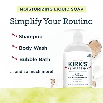 - SENSITIVE SKIN FRIENDLY Our 3 in 1 is clinically tested, safe for sensitive skin. Free of Sulfates, Parabens, Phthalates, EDTA, Artificial Fragrance, Colorants, Gluten, Non-GMO project verified and Vegan. Kirk’s Nourishing Cleanser is great for the whole family! Sold in a convenient 32 oz. pump bottle.