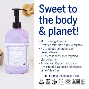 - PACKAGED IN 100% RECYCLED PLASTIC: Dr. Bronner’s lavender sugar soap comes in 100% post-consumer recycled plastic bottles—helping reduce landfill waste & supporting a more sustainable planet. A trusted Dr. Bronner’s liquid soap alternative to castile