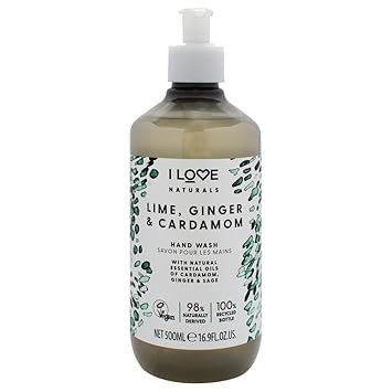 Experience the refreshing sensation of I LOVE Naturals Lime, Ginger, and Cardamom Hand Wash. Delight in its luxurious lather, effectively cleansing without drying your skin, and leaving your hands feeling revitalized, moisturized, and irresistibly smooth. Enriched with Pro Vitamin B5 and crafted with plant-based cleansers, this hand wash not only cleanses but also nourishes, promoting hydration for hands that look and feel healthier. Infused with a blend of lime, ginger, cardamom, orange, and sage essential oils, each use leaves your hands delicately fragranced, turning your hand washing routine into a luxurious and rejuvenating ritual. Prioritizing your self-care journey, I LOVE ensures that all our bath and body products are meticulously formulated with natural ingredients, enhancing your well-being and uplifting your mood. Our UK-made formulas are vegan, cruelty-free, and free from harsh chemicals, including parabens, petroleum-based ingredients, phthalates, and SLS, so you can indulge in a truly delightful and guilt-free experience every time you wash your hands.