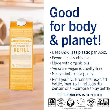 - MADE WITH ORGANIC OILS & CERTIFIED FAIR TRADE INGREDIENTS: Dr. Bronner's Pure-Castile Liquid Soaps are made with over 70% certified organic & fair trade ingredients, promoting healthy communities, ethical working conditions & fair prices. And now sourcing Regenerative Organic Certified coconut, palm kernel, and olive oil