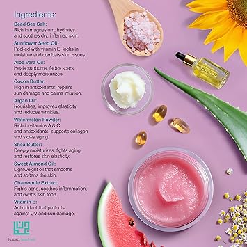 Juman Dead Sea Minerals Watermelon Body Scrub | Infused with Shea and Cocoa Butter | Removes Dead Skin Cells and Rejuvenate Dull Skin | SlS & Paraben Free | Vegan | 11.46 Oz
