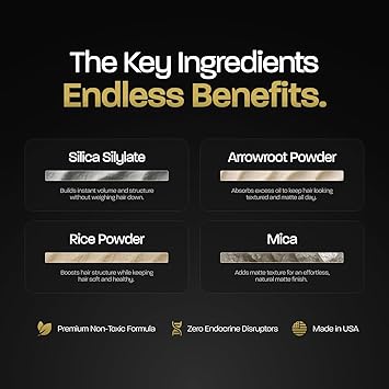 - QUALITY INGREDIENTS: Our Hair Texturizing Powder is 100% vegan and cruelty free. Made in The United States with no Sulfates, Parabens, or Phthalates. We only use 5 ingredients: Silica Silylate, Oryza Sativa (Rice) Starch, Silica, Mica, & Maranta Arundinacea Root Extract so you know exactly what you’re putting in your hair.
