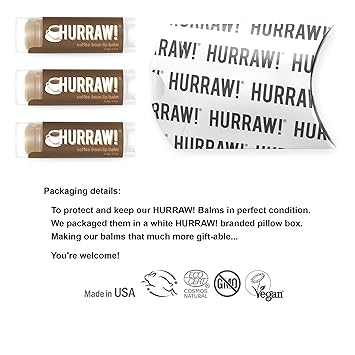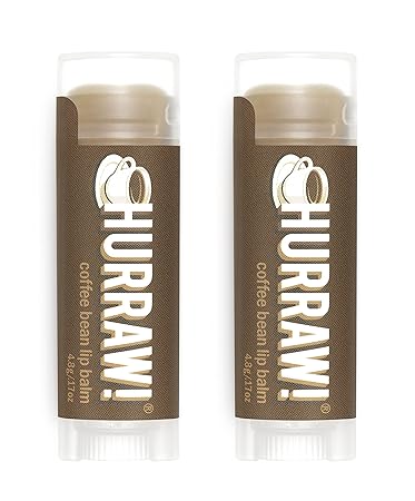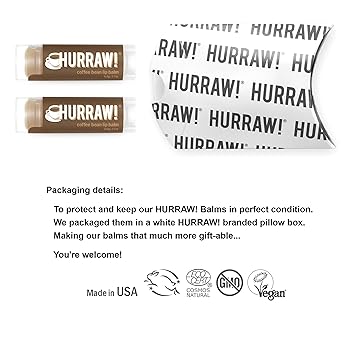 - TWO 4.8g/.17oz Oval Tubes of Coffee Bean Lip Balm packaged in a white HURRAW! branded pillow box. Coffee bean extract and a touch of raw chocolate gives our balm a mild coffee-choco flavor and buzz. Not your normal cup-o-joe! Made with certified organic, vegan, and raw ingredients. Hurraw! Lip Balms are certified 100% all natural origin, cruelty and gluten free. Non-GMO. Bee, Shea, Soy and Palm Free.