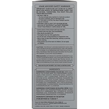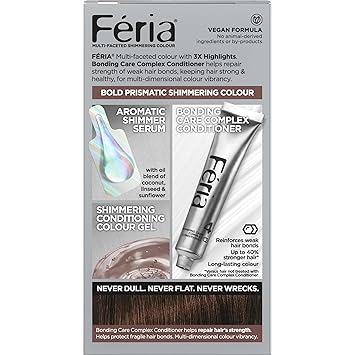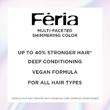 With Feria, what you see is the shimmer. Multi-Faceted shimmering color with 3X highlights delivers intensified, brilliant results. Inspired by cutting-edge fashion, Feria's prismatic color spectrum is custom-blended by L'Oreal master colorists for bold, head-turning shades - no appointment necessary. The revolutionary Power Shimmer Conditioner hydrates and conditions week after week so hair is never wrecked or ravaged.