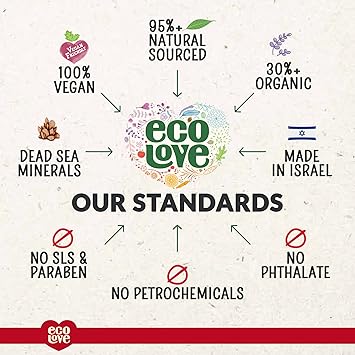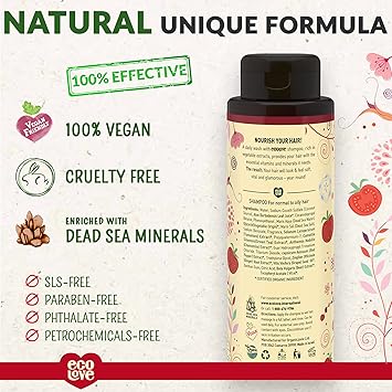 - NATURAL & ORGANIC INGREDIENTS: ecoLove Red Collection Shampoo is free from SLS, parabens and petrochemicals. 95% nature derived ingredients (30% organic). Enriched with essential oils, organic herbs & plant extracts and 26 Dead Sea minerals.