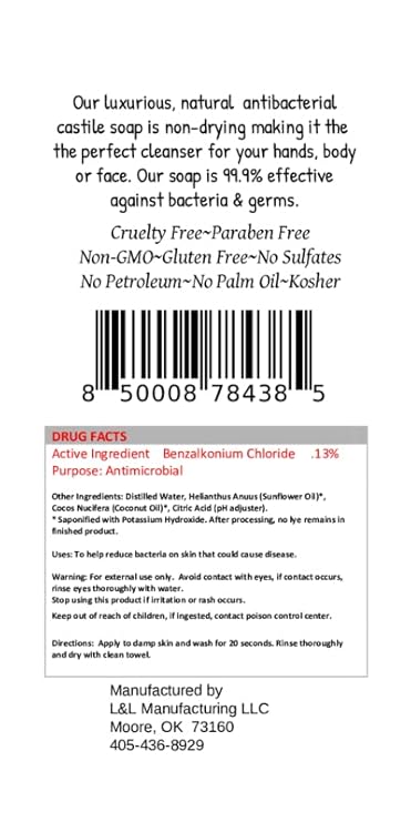 - Our Unscented Antibacterial Castile Soap contains .13% Benzalkonium Chloride as recommended by the FDA to kill 99.9% of germs and bacteria. This is the same ingredient used in baby wipes and contact lens solution. It is gentle and very effective. LandLSoap is free of artificial dyes, preservatives, and unnecessary chemicals. We make products that are simple and work well. Every ingredient has a purpose, and we use no fillers or artificial thickeners.