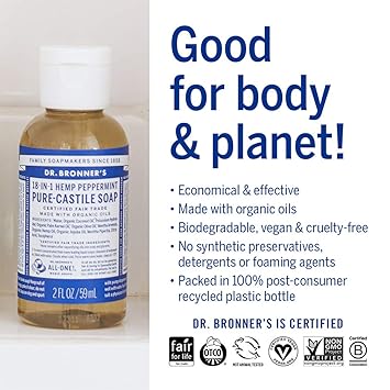 Dr. Bronner's - Pure-Castile Liquid Soap (Peppermint, Travel Size, 2 ounce) - Made with Organic Oils, 18-in-1 Uses: Face, Body, Hair, Laundry, Pets and Dishes, Concentrated, Vegan, Non-GMO