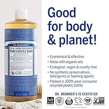 - MADE WITH ORGANIC OILS & CERTIFIED FAIR TRADE INGREDIENTS: Dr. Bronner's Pure-Castile Liquid Soaps are made with over 70% certified organic & fair trade ingredients, promoting healthy communities, ethical working conditions & fair prices.