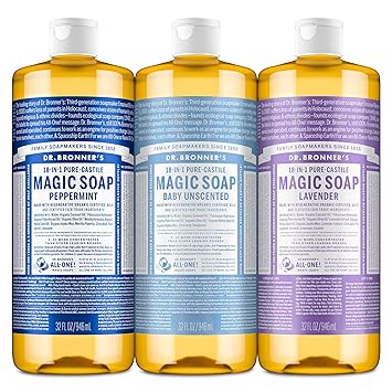 Dr. Bronner's Pure-Castile Magic Liquid Soap Made with Regenerative Organic Oils, Vegan, Concentrated, Body Wash- For Face, Hair, Laundry - 32oz Variety 3-Pack (Peppermint, Baby Unscented, Lavender)