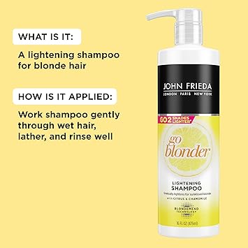 Go lighter and brighter as you wash. John Frieda Sheer Blonde Go Blonder Lightening Shampoo cleanses while gradually brightening up natural, color-treated, or highlighted blonde shades. With citrus extract and chamomile, this shampoo helps to deliver illuminated, sun-kissed color, while strengthening hair. Mild enough to use every day, John Frieda Sheer Blonde Go Blonder Lightening Shampoo by Kao USA is ammonia- and peroxide-free and leaves blonde hair feeling as good as it looks. Satisfaction Guaranteed. Limitations may apply.