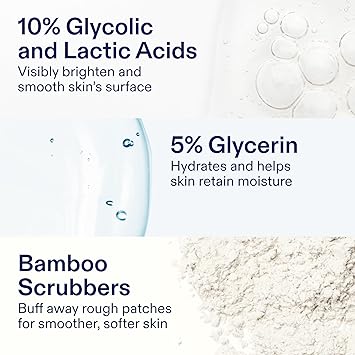 - INGREDIENTS - 5% Glycolic Acid illuminates and smooths skin's surface. 5% Lactic Acid gently smooths. 5% Glycerin hydrates and helps skin retain moisture. Bamboo Scrubbers buff away rough patches for smoother, softer skin.