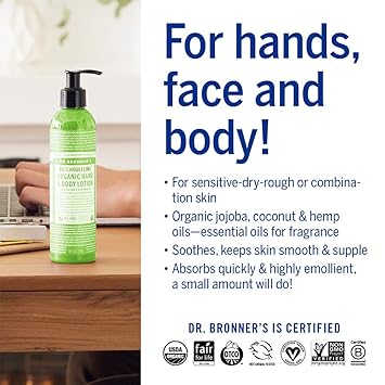 - USDA ORGANIC & FAIR TRADE INGREDIENTS: Dr. Bronner's Organic Lotions are formulated with organic jojoba oil to heal & soothe, organic coconut oil to moisturize, organic hemp & avocado oils to keep skin smooth & supple. OK!