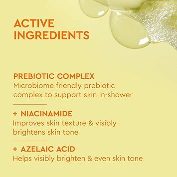 This radiance-enhancing, pH-balanced body cleanser diminishes dullness to deliver potent brightening benefits. The rich texture transforms into a luxurious lather that deeply cleanses and evens skin tone while balancing the skin's barrier from first use. Infused with our microbiome-boosting Prebiotic Complex, plus Niacinamide and Azelaic Acid to help improve uneven skin tones, the appearance of hyperpigmentation and textured skin for glowing results post-shower.