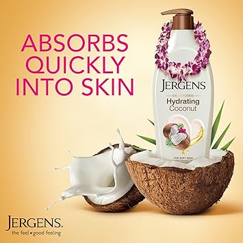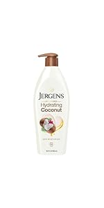 Transport yourself to an island paradise with Jergens Hydrating Coconut Body Lotion, lightly scented with tropical coconut. This oil-infused, non-greasy lotion hydrates instantly and leaves your skin feeling silky smooth. Blended with the power of coconut water and nourishing coconut oil, Jergens moisturizing lotion targets dry skin and leaves it looking healthy, radiant and supple. This is the perfect moisturizing lotion for dry skin. If you have dry hands, elbows or legs, get relief fast with Jergens Hydrating Coconut Hand Lotion. This lotion for dry skin absorbs quickly without feeling tacky, sticky or greasy. Our dermatologist tested body lotion is vegan friendly, cruelty free and doesn’t contain parabens and artificial dyes. Just smooth Jergens Hydrating Coconut Hand and Body Lotion for dry skin on your dry skin daily for refreshed, hydrated skin. OUR STORY: Since 1901, Jergens skin care has been the trusted brand for comforting moisture. We bottle all that up into the Feel-Good Feeling of Jergens - soothing relief from dryness, a touch of summer color, a fruity scent that makes Monday feel like Friday. We’re here to help you feel truly, deeply, skin-to-soul comfortable, with a few surprises along the way.