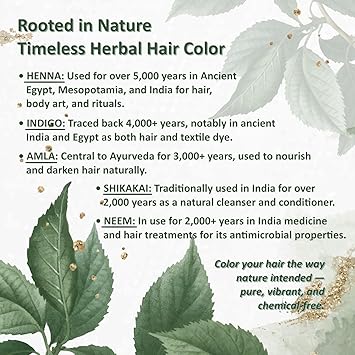 - Orgainc plant-based ingredients i.e. henna, indigo, amla, false daisy. We use the finest quality of each ingredients and triple sift powders for the perfect non-clumpy paste; Each ingredient is fresh to maximize the result;