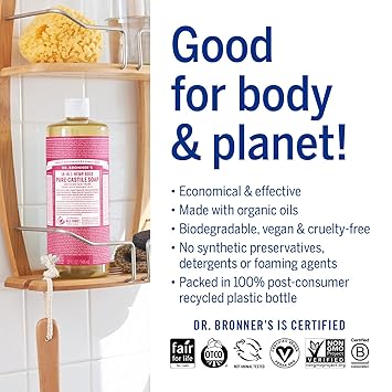 - MADE WITH ORGANIC OILS & CERTIFIED FAIR TRADE INGREDIENTS: Dr. Bronner's Pure-Castile Magic Soap are made with over 70% certified organic & fair trade ingredients—an ethical, sustainable choice and a gentle castile body wash for all!