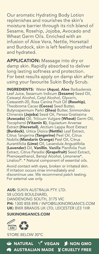 - VEGAN NATURAL BODY CARE: Formulated using the best natural ingredients such as aloe vera and rosehip oil, Sukin body care products assist in balancing the skin’s oils, leaving it soft, nourished and hydrated.