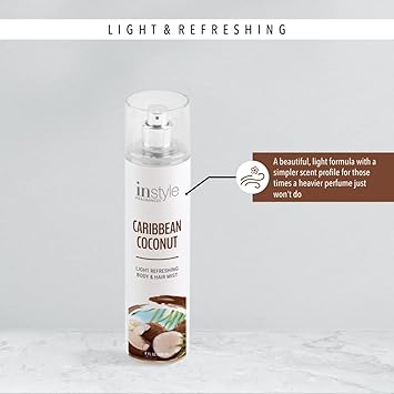 Instyle Fragrances | Body & Hair Mist | Caribbean Coconut Scent | With Panthenol | CLEAN, Vegan, Paraben Free, Phthalate Free | Premium 8 Fl Oz Spray Bottle