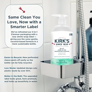 - SENSITIVE SKIN FRIENDLY Our 3 in 1 is clinically tested, safe for sensitive skin. Free of Sulfates, Parabens, Phthalates, EDTA, Artificial Fragrance, Colorants, Gluten, Non-GMO project verified and Vegan. Kirk’s Nourishing Cleanser is great for the whole family! Sold in a convenient 32 oz. pump bottle.