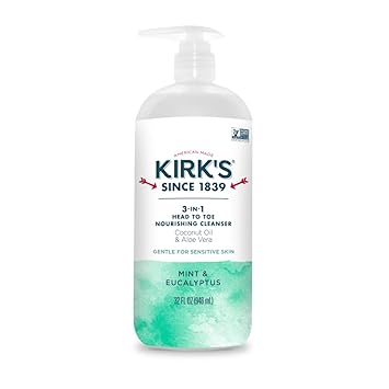 Kirk's 3-in-1 Head to Toe Nourishing Liquid Cleanser - for Men, Women, & Children - Premium Coconut Oil & Aloe Vera - Non GMO & Vegan - Mint and Eucalyptus - 32 Fl Oz.