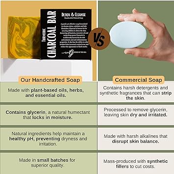 Clearer, Healthier-Looking Skin—Naturally Discover the skin-loving power of our Turmeric Charcoal Bar—a handcrafted soap designed to support a clearer, more radiant-looking complexion. Made with evening turmeric and detoxifying activated charcoal, this gentle cleanser helps promote improved skin clarity, smoothness, and natural vibrance. Perfect for dull, congested, or blemish-prone skin, our vegan, organic formula deeply cleanses without stripping moisture. Free from harsh chemicals and synthetic fragrances, it’s ideal for daily use on both face and body—leaving skin feeling clean, refreshed, and comfortable. Supports a natural glow - with turmeric and botanical ingredients Helps detox pores - charcoal draws out dirt, oil, and buildup Promotes smoother skin - gentle exfoliation with each wash Handcrafted & plant-based - made with pure, simple ingredients Your New Daily Essential for Fresh, Vibrant Skin How to Use: Wet the bar and create a rich lather Gently massage onto face and body, focusing on areas of buildup Rinse thoroughly and pat dry Use daily for best results