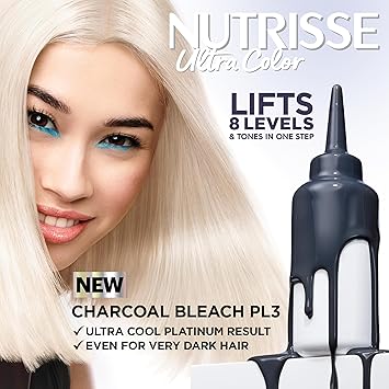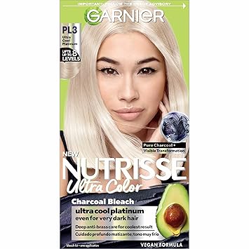 Garnier Ultra Color Charcoal Bleach PL3 Ultra Cool Platinum is our most performing lightening kit formulated to deliver our coolest result, even for very dark hair with less brassiness. It provides up to 8 levels of lift. Best for anyone with medium brown to darkest brown hair. Formulated with pure charcoal, a blend of 5 fruit oils, and an anti-brass conditioner, our kit will give you a bold and beautiful cool platinum result. Our deep blue conditioner helps neutralize even the warmest undertones and helps achieve a high blonde impact in just one step. It will leave your hair twice as shiny, nourished, and silky*.*vs. uncolored, unwashed hair* when using full kit with conditioner vs without conditioner