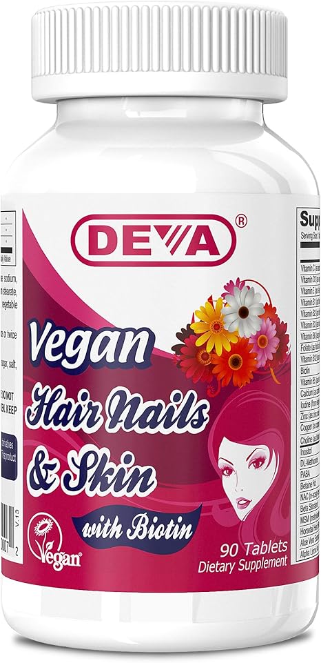 Brand: Deva Nutrition Product Code: 30000 Description Features Supplement Facts Vegan Hair-Nails-Skin Supplement Cells responsible for hair growth, smooth and healthy skin, and strong nails tend to be very active and require a steady supply of nutrients. Many necessary nutrients may not be delivered to the body externally. What makes our product unique is the synergetic formula. Besides beneficial vitamins and minerals, our product also contains Aloe Vera, L-Cysteine (non-animal source), MSM, Methionine, Rosemary Extract, Sage Extract, Fenugreek Extract, and Horsetail Herb Extract (Silica). Biotin may be an important factor in normal hair growth according to some nutritionists. In addition, many multivitamins may not even have or have very little Biotin. Our Vegan Hair Nails & Skin product has 500 mcg of Biotin (1667% DV) per tablet*. DEVA Hair Nails & Skin Supplement is 100% animal-free and guaranteed for purity, freshness, and labeled potency. Remember all DEVA Products are 100% vegan, vegetarian and are registered by the Vegan Society, the non-profit organization that actually invented the word "vegan". SKU: 30000 UPC: 895634000072 Size: 90 Tablets With Biotin, Rosemary & Sage Extracts and more... NO ANIMAL INGREDIENTS Vegan Society Registered Supplement Facts Serving Size: 1 Tablet ~ Serving Per Container: 90 Amount Per Serving % Daily Value* Vitamin C (Ascorbic Acid) 30 mg 33% Vitamin D2 (as ergocalciferol) 5 mcg 25% Vitamin E (D-Alpha Tocopheryl) 10 mg 67% Vitamin B1 (Thiamine Mononitrate) 2.5 mg 208% Vitamin B2 (Riboflavin) 2.83 mg 218% Vitamin B3 (Niacinimide) 12 mg 75% Vitamin B6 (Pyridoxine Hcl) 5 mg 294% Folic Acid 100 mcg DFE 25% Vitamin B12 (Cyanocobalamin) 25 mcg 1042% Biotin 500 mcg 1667% Vitamin B5 (D-Calcium Pantothenate) 27.5 mg 550% Calcium (carbonate & dicalcium phosphate) 111 mg 9% Iodine (from kelp)(whole plant) 75 mcg 50% Zinc (Oxide) 5.5 mg 50% Copper(Gluconate) 0.12 mg 13% Choline (Bitartrate) 25 mg 5% Inositol 25 mg * DL-Methionine 25 mg * PABA 25 mg * Betaine Hcl 12 mg * L-Cysteine (fermentation source) 50 mg * Beta Sitosterol 50 mg * MSM (Methylsulfonylmethane) 250 mg * Horsetail Herb Silica Extract 50 mg * Aloe Vera (from 200:1 extract) 100 mg * Alpha Lipoic Acid 10 mg * Fenugreek Extract 25 mg * Rosemary Extract 37 mg * Sage Extract 12 mg * *Daily Value not Established Other Ingredients: Cellulose, vegetable stearic acid, croscarmellose sodium, vegetable magnesium stearate, silica, cinnamon, clove, hypromellose, vegetable glycerin, carnauba wax. (All of the ingredients are from non-animal sources) Recommended Use For adults, take one (1) or two (2) tablets daily, preferably with food, or as directed by a doctor. Food Sensitivity Free of yeast, wheat, gluten, sugar, salt, dairy, egg, shellfish; animal products, byproducts or derivatives. Warnings Always consult your doctor before taking any dietary supplement. Disclaimer *Information and statements regarding dietary supplements on our website have not been evaluated by the Food and Drug Administration and our products are not intended to diagnose, treat, cure, or prevent any disease. Individual results may vary. By using this site, you signify your assent to this Terms of Use Agreement. If you do not agree to the terms and conditions contained in this Terms of Use Agreement , you may not access or otherwise use this site and its contents.