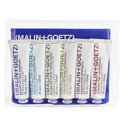 Malin + Goetz Essentials Starter Kit, Set of 6, 1 Fl. Oz. - Face Cleanser, Face Moisturizer, Hand & Body Wash, Body Moisturizer, Hair Shampoo & Conditioner - Travel Size Toiletries