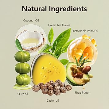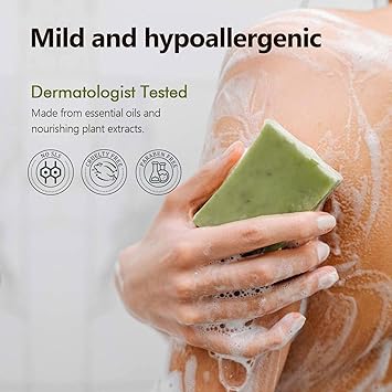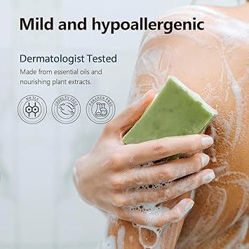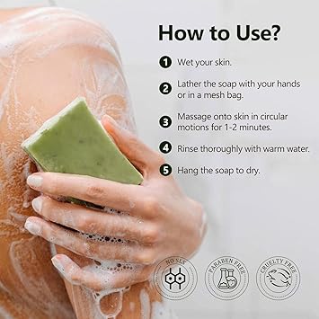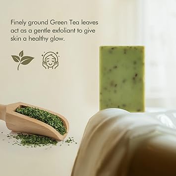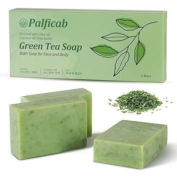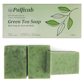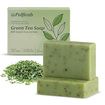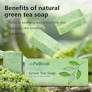 - GREEN SOAP: Our green tea soap bars is added with green tea leaves, which can remove dead skin cells on the surface of the skin, making the skin smoother and more delicate; green tea soap for glowing skin. Green tea is rich in tea polyphenols, which has a powerful antioxidant effect. It can help eliminate free radicals, delay skin aging, maintain skin elasticity and radiance; it also reduces skin inflammation and the occurrence of acne. This natural organic soap containing green tea is ideal for sensitive and acne-prone skin, providing gentle care for delicate complexions