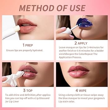 - 3-STEP APPLICATION: APPLY → WAIT5-8MIN → WIPE OR CLEAN 1.Trace lips generously 2.Let dry 5-8mins 3.Wipe with a damp tissue or rinse gently with water.