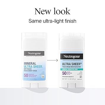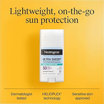 Neutrogena Ultra Sheer Mineral Sunscreen Stick with Broad Spectrum SPF 50. Body & face sunscreen stick provides powerful sun protection that you will love to wear without the heavy finish. Gentle enough for sensitive skin, this mineral sunscreen stick has an easy-to-apply, non-greasy, dry-touch formula that leaves skin feeling soft and smooth with no white residue. Moisturizing sunscreen with vitamin E helps fight signs of skin aging due to sun exposure when used as directed with other sun protection measures. Vegan & 100% mineral active sunscreen is Hawaii Act 104 compliant & contains 21.6% zinc oxide. Formula not tested on animals and free of fragrances, parabens, sulfates, phthalates and mineral oil. Non-comedogenic so it won't clog pores or lead to breakouts. This Neutrogena sunscreen is water-resistant for up to 80 minutes & comes from a dermatologist recommended sun care brand. Apply prior to sun exposure to keep skin protected during activities like gardening, hiking, or walking.