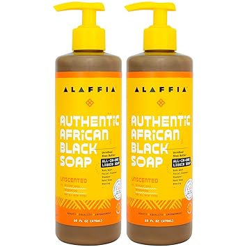 Alaffia Authentic African Black Soap Variety 2-Pack - All-In-One Liquid Soap, Travel-Size Eucalyptus Tea Tree + Pump Bottle Unscented Body Wash, Face Wash, Shampoo, Shaving Soap