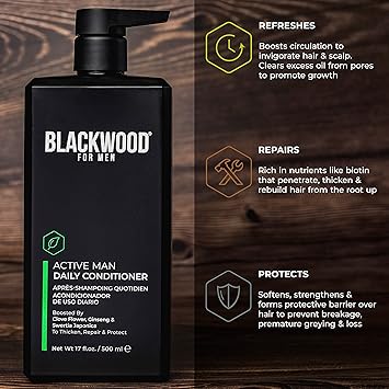 BLACKWOOD FOR MEN Active Man Daily Conditioner - Men's Thickening Conditioner for Hair Loss & Dandruff - Deep Treatment for Shine - Natural Vegan Formula - Sulfate, Paraben, & Cruelty-Free (17 Oz)