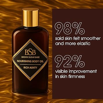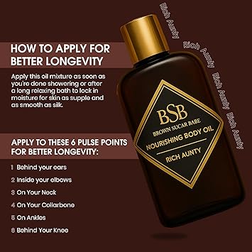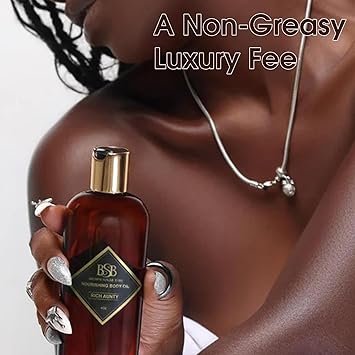 - A Non-Greasy Luxury Feel: Rich Aunty Body Oil absorbs effortlessly, creating a velvety finish on the skin. It's the perfect layering piece to pair with your favorite perfume or to wear on its own for a subtle yet captivating scent.