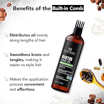 - Comb Applicator: The Biotin premium hair oil comes with a comb applicator that evenly distributes oil, smoothens knots & frizzes, making the application process effortless