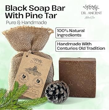Dr.Ancient Black Soap Bar with Pine Tar, Organic, Natural, Vegan, Handmade,Traditional, Chemical Free face & body bar Soap, Anti Fungal, Acne, Eczema, Itchy Skin, Cellulite, antiseptic soaps