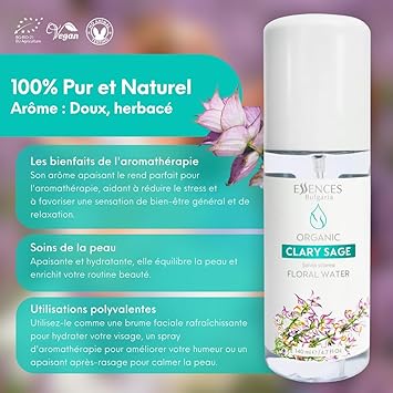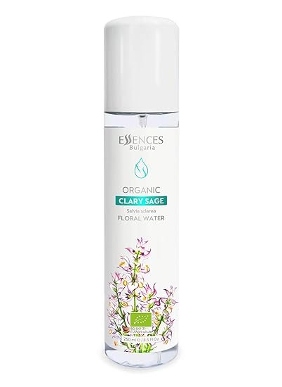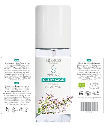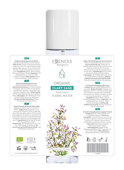 - Organic 'Clary Sage' floral water (Organic Certified BG-BIO-21), 100% pure and natural hydrosol. Irreplaceable caress for problematic skin or damaged hair.
